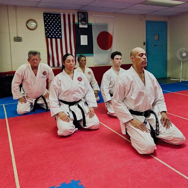 Meditating is a major part of our training. Each class begins and ends in Mokuso (meditation) which helps in mental development. The goal is to attain a state of Mushin or "no mind."