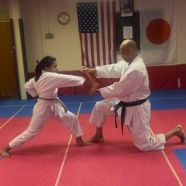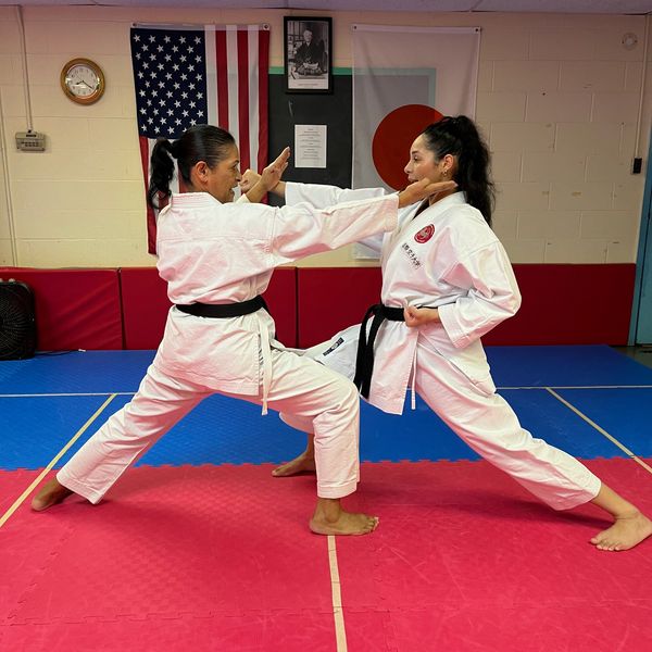 Black belt students Krystal Singh (2nd Dan) and Rushell Singh (1st Dan) practicing one step sparring (ippon kumite) at the dojo in Freeport.