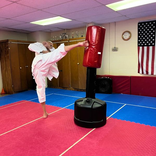 Sensei Brian executing a "mawashi-geri" roundhouse kick. This is one of Sensei Brian's favorite kicks.